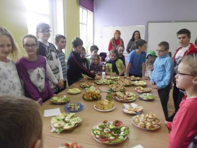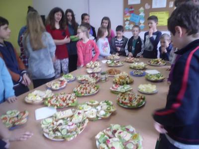 Przed świętami wielkanocnymi każda klasa przygotowała w swojej sali potrawy, przekąski na wspólne, uroczyste śniadanie wielkanocne. Dzieci bardzo aktywnie włączyły się w przygotowanie stołu, wcześniej przyniosły z domu produkty oraz wiosenno – świąteczne oznaki budzącej się do życia przyrody: bazie, żonkile, bukszpan, itp. tworząc z nich kolorowe stroiki. Wszystkie te wspólnie wytworzone akcenty wielkanocne znalazły się na świątecznym stole w szkole.