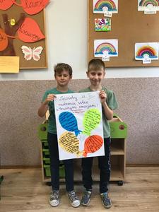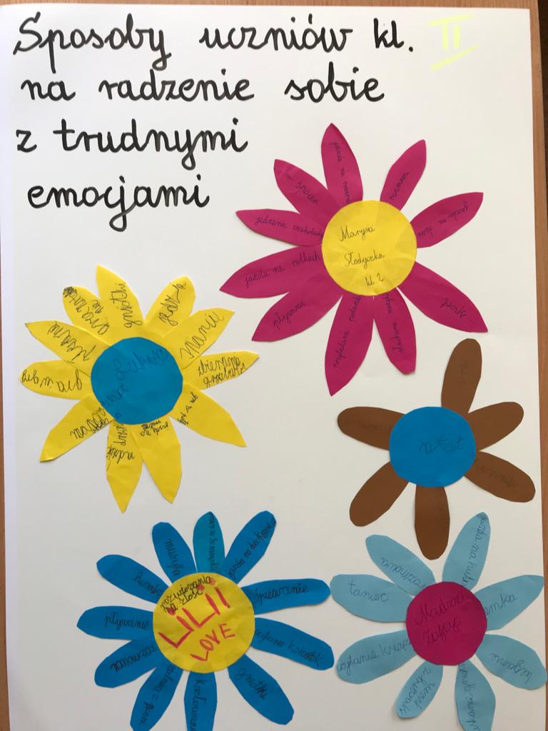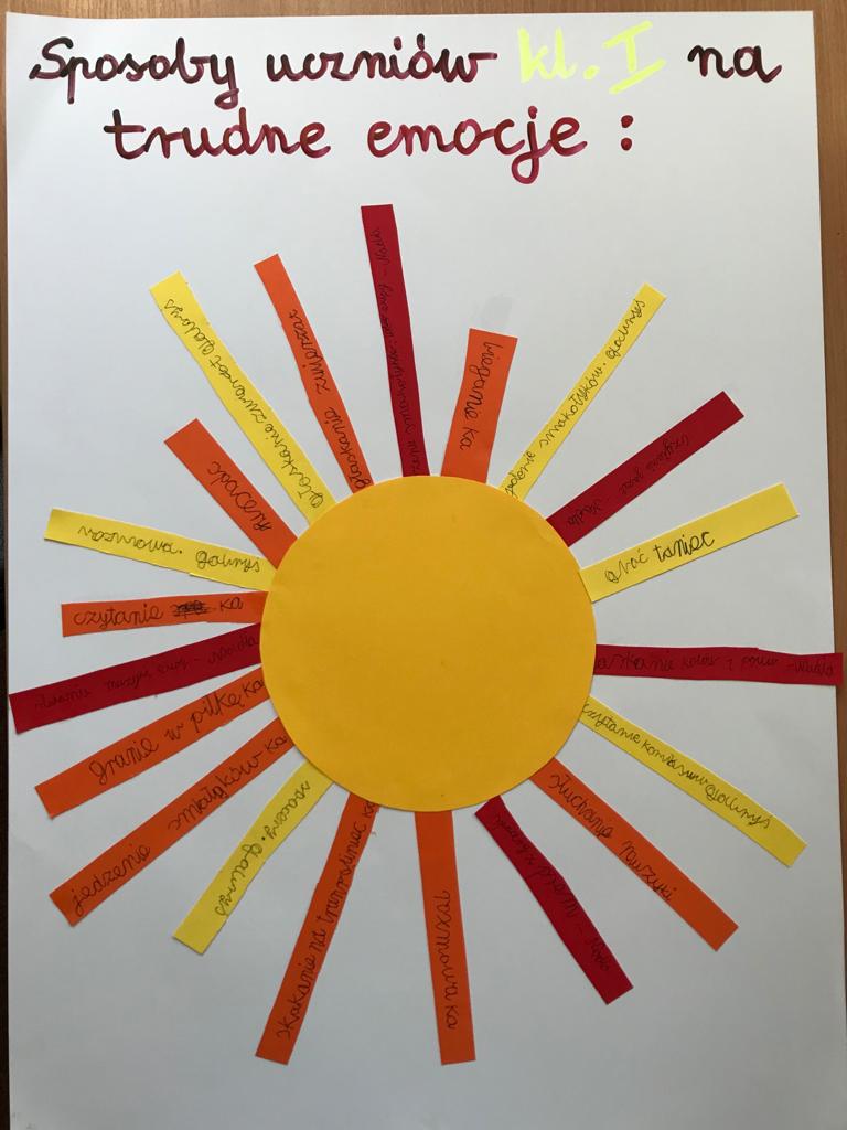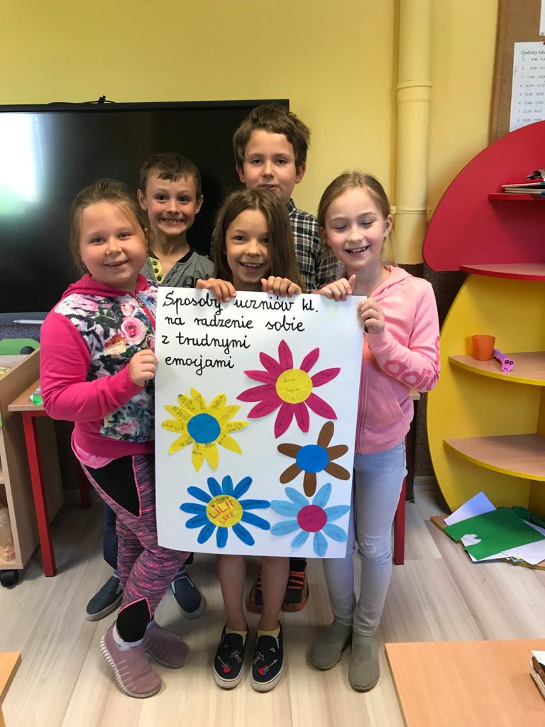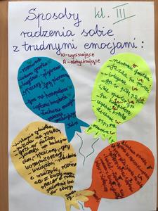 W zeszłym tygodniu uczniowie z klas I-III, uczestniczyli w zająciach z pedagogiem szkolnym, nt. "Sposobów radzenia sobie z trudnymi emocjami, tj. lęk, złość, poczucie przygnębienia". Rozpoznawali emocje na podstawie ilustracji i opisu sytuacji, podawali sposoby radzenia sobie z nimi oraz wykonali kolorowe plakaty na ten temat. Powstały piekne projekty