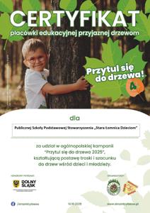 Z radością informujemy, że nasza szkoła otrzymała CERTYFIKAT placówki edukacyjnej przyjaznej drzewom za udział w ogólnopolskiej kampanii "Przytul się do drzewa 2025"!
