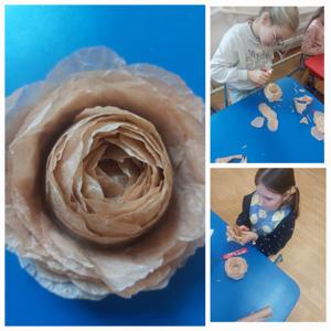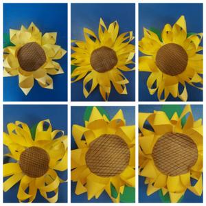 Kwiatowe kompozycje: Wyczarowaliśmy przestrzenne słoneczniki z żółtego papieru oraz niezwykle realistyczne róże z bibuły, które zachwycają swoją delikatnością. 🌻🌹