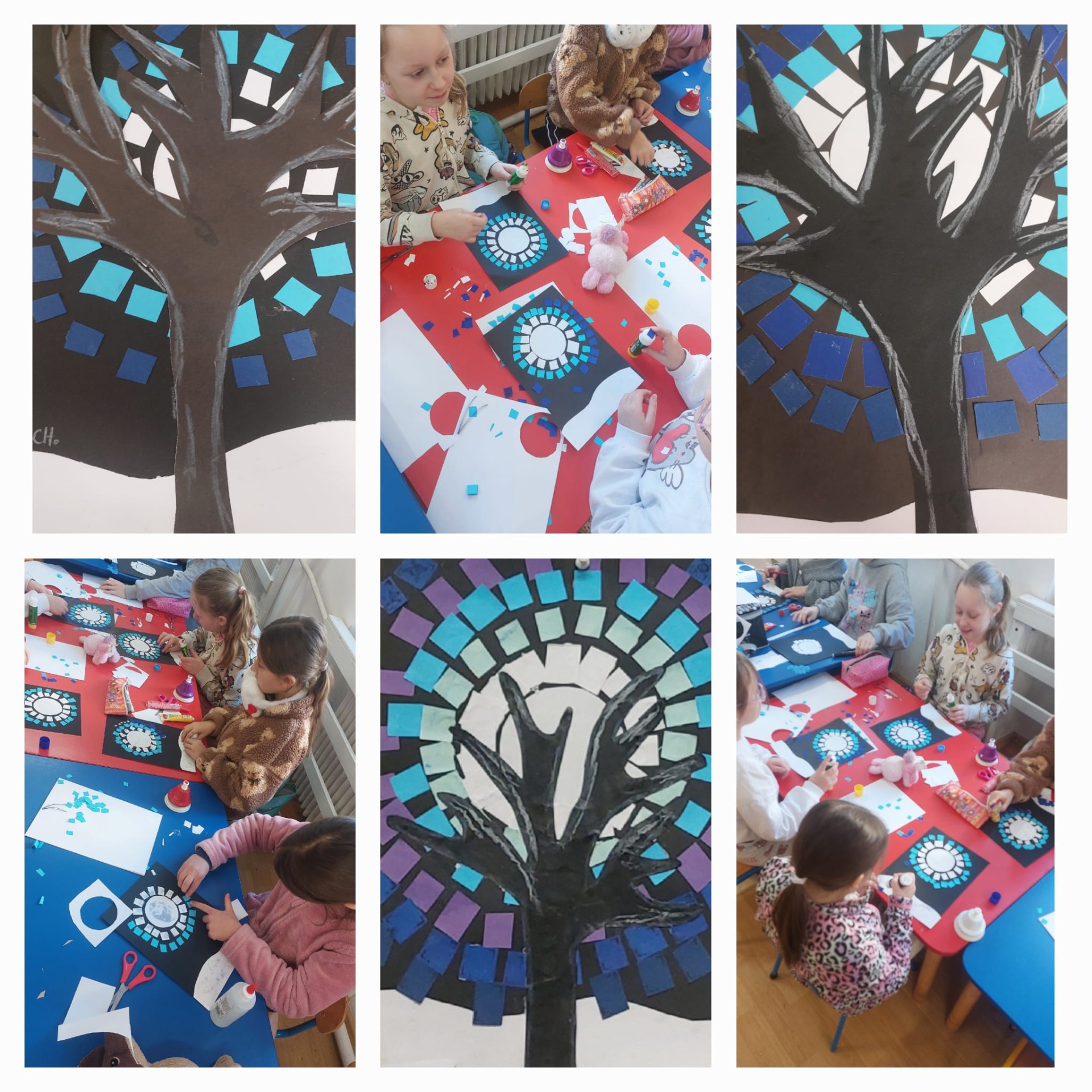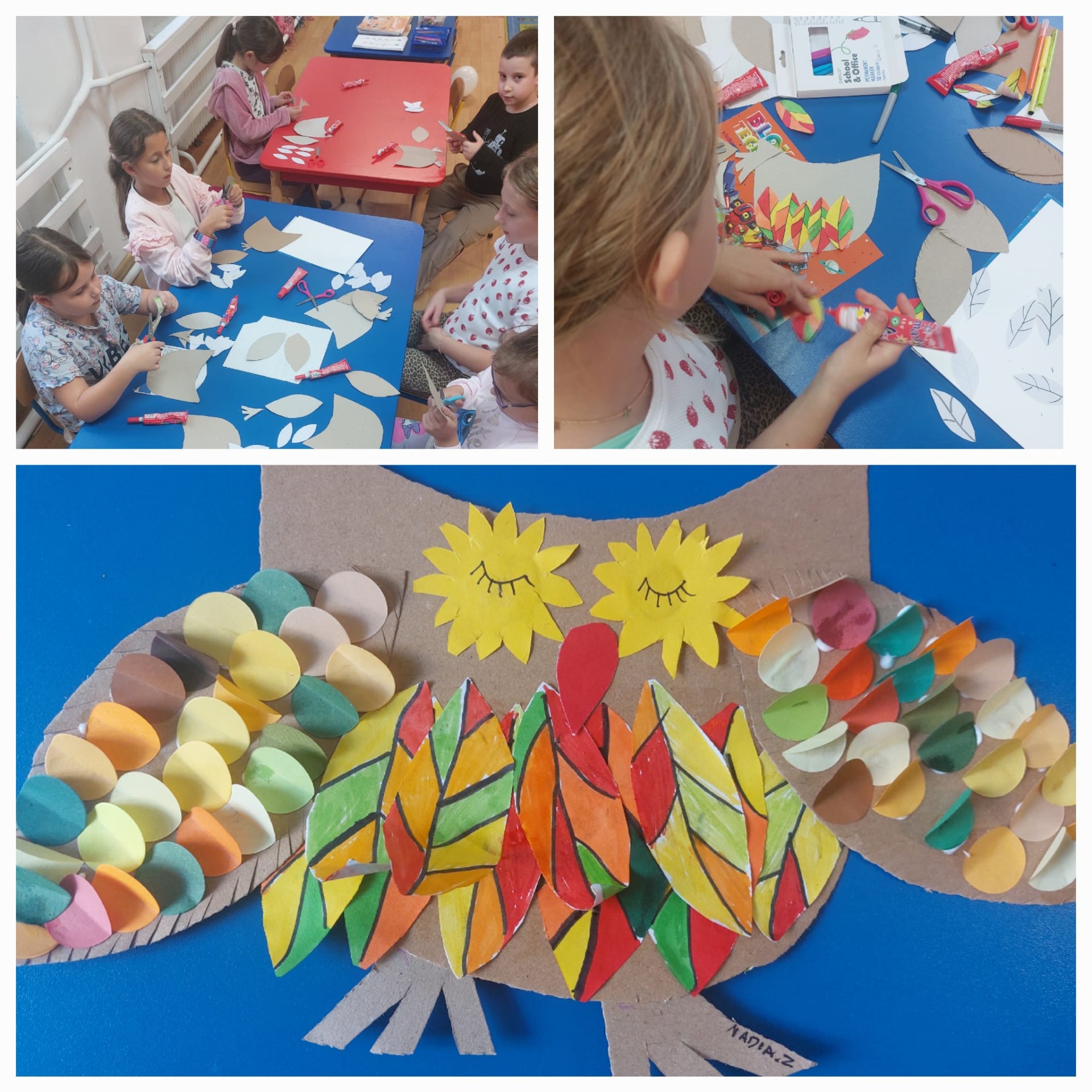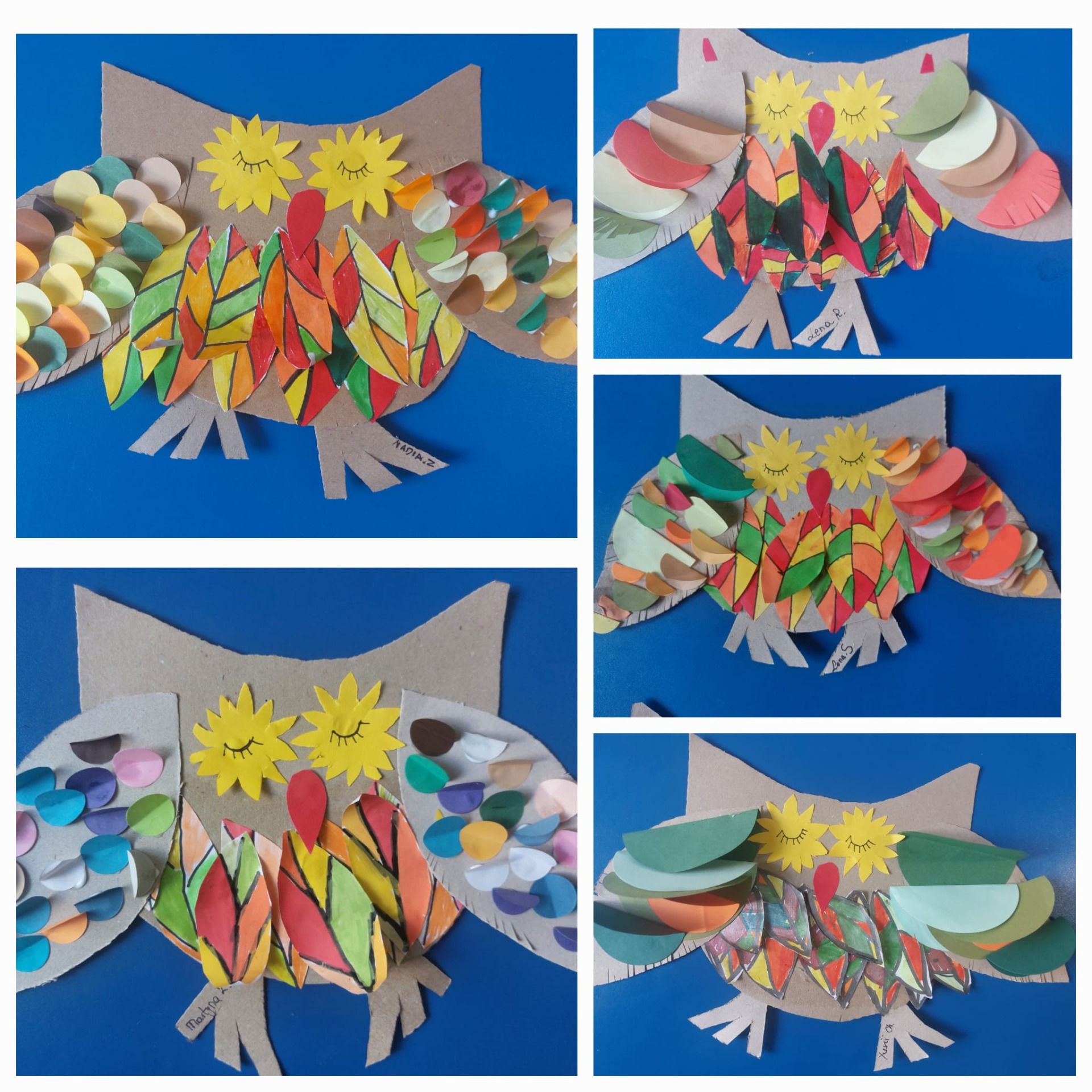 Jesienne inspiracje: Kolorowe sowy z tektury, ozdobne zawieszki z liśćmi oraz misternie wyklejane mozaiki przedstawiające zimowe drzewa na tle nocnego nieba. 🦉🍂